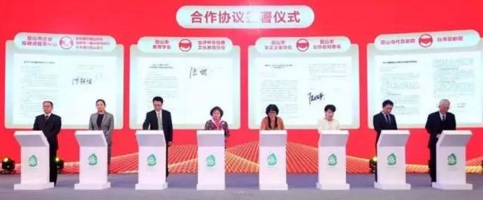 ▲圖為在昆山市貫徹落實《關于促進兩岸經濟文化交流合作的若干措施》工作推進會上,昆山當代昆劇院與臺灣昆劇團簽訂合作協議。右一:臺灣昆劇團團長洪惟助教授;右二:昆山當代昆劇院總經理張克明。