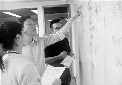 華強北國際創客中心員工正在討論如何更好地服務進駐中心的創客。李思宏攝