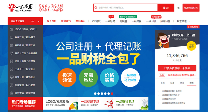 對(duì)于一個(gè)公司或企業(yè)來說,從其誕生到發(fā)展的整個(gè)過程中,與之相關(guān)的的品牌營(yíng)銷、公司創(chuàng)建、傳播推廣、網(wǎng)站建設(shè)、商標(biāo)注冊(cè)、法律服務(wù)甚至是融資等等,除了生產(chǎn)制造之外的環(huán)節(jié),都可以在一品威客網(wǎng)平臺(tái)上完成。