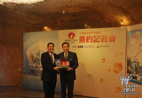Min-Tsai Hsu, mayor of Hsinchu, signs an agreement with the Taiwan Pavilion's operator, Taipei World Trade Center.