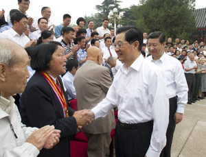 President Hu Jintao met with exemplary members of the Communist Party of China (CPC) at a symposium held on Saturday to commemorate the 90th founding anniversary of the CPC.