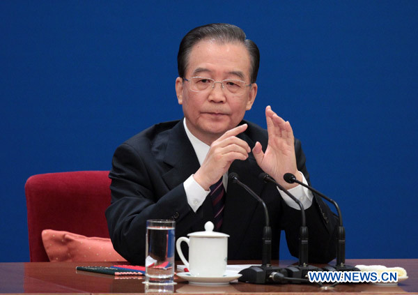 Chinese Premier Wen Jiabao answers questions during a press conference after the closing meeting of the Fourth Session of the 11th National People's Congress (NPC) at the Great Hall of the People in Beijing, China, March 14, 2011.(Xinhua/Xing Guangli)
