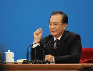 Chinese Premier Wen Jiabao greets the journalists when arriving at a press conference after the closing meeting of the Fifth Session of the 11th National People's Congress (NPC) at the Great Hall of the People in Beijing, capital of China, Mar...