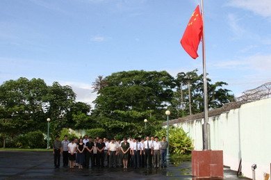 當地時間8月15日早8時,中國駐圭亞那使館全體館員和援圭醫療隊專家在使館舉行降半旗儀式,深切悼念在甘肅省舟曲縣特大山洪泥石流災害中遇難的同胞。全體人員默哀三分鐘,遙寄哀思。