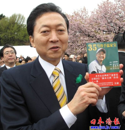 在“賞櫻會(huì)”上,受邀參加的日本僑報(bào)社張景子社長向鳩山首相贈(zèng)送了該社出版的《35號投手溫家寶》,鳩山首相欣然收下,并勉勵(lì)日本僑報(bào)社繼續(xù)為日中交流做貢獻(xiàn)。張景子說,“我們來自中國,在日本創(chuàng)辦的日本僑報(bào)出版社致力于日中交流,已經(jīng)出版了200來本書。2008年出版了中日文版《35號投手溫家寶》,今天特地給您帶來了一本。”鳩山首相高興地從張景子手中接過《35號投手溫家寶》一書,仔細(xì)端詳,并說:“我下個(gè)月就要與溫家寶總理會(huì)面。希望你們繼續(xù)努力,為促進(jìn)日中交流作出更大的貢獻(xiàn)。”說完,鳩山首相高高地舉起《35號投手溫家寶》一書,讓大家拍照。