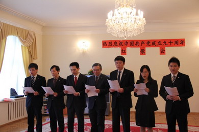 謝總領(lǐng)事在致辭中表示,今年是中國(guó)共產(chǎn)黨建黨九十周年,中國(guó)駐圣彼得堡總領(lǐng)館黨委今天在“紅五月”開始的第一天舉辦紅歌會(huì),慶賀建黨九十周年,以此拉開駐圣彼得堡總領(lǐng)館慶祝建黨九十周年系列活動(dòng)的序幕。謝總表示,紅歌是中國(guó)革命、建設(shè)和改革開放各個(gè)時(shí)期產(chǎn)生和流傳的紅色經(jīng)典歌曲,是社會(huì)主義中國(guó)的時(shí)代主旋律。紅歌錄制美好的記憶,每當(dāng)唱起這些曲調(diào)優(yōu)美、語言精煉、內(nèi)容向上的紅歌,就仿佛把我們帶到那烽火連天的戰(zhàn)爭(zhēng)時(shí)代,帶到那熱火朝天的建設(shè)工地,帶到那欣欣向榮、改革開放的城市和鄉(xiāng)村!紅歌引領(lǐng)正確的方向,每當(dāng)唱起紅歌,我們就更加堅(jiān)定共產(chǎn)主義理想和建設(shè)有中國(guó)特色社會(huì)主義的信念,使命感和責(zé)任感更強(qiáng),艱苦奮斗、自強(qiáng)不息的自覺性更高!紅歌提振向上的士氣,每當(dāng)唱起紅歌,我們就感到熱血沸騰、激情澎湃,為理想、為事業(yè)更加無所畏懼,精神狀態(tài)和革命斗志更加昂揚(yáng)!紅歌凝聚人心,每當(dāng)唱起紅歌,我們就更加團(tuán)結(jié)奮進(jìn)、萬眾一心,凝聚力和戰(zhàn)斗力更強(qiáng)!謝總指出,今年既是中國(guó)共產(chǎn)黨建黨九十周年,同時(shí)也是我國(guó)第十二個(gè)五年計(jì)劃的開局之年,以加快經(jīng)濟(jì)發(fā)展方式、大力調(diào)整經(jīng)濟(jì)結(jié)構(gòu)和進(jìn)一步改善民生為重點(diǎn)的各項(xiàng)改革和發(fā)展任務(wù)十分繁重和艱巨。與此同時(shí),以服務(wù)國(guó)家主權(quán)、安全和發(fā)展利益為主要內(nèi)容的新時(shí)期外交工作同樣任重道遠(yuǎn)。新時(shí)期、新任務(wù)和新要求呼喚科學(xué)發(fā)展,創(chuàng)新發(fā)展,與時(shí)俱進(jìn),同時(shí)也呼喚繼承和發(fā)揚(yáng)優(yōu)良傳統(tǒng)、優(yōu)良作風(fēng)和優(yōu)良精神。我們舉辦紅歌會(huì),一方面是通過這些紅歌歌頌黨、歌頌祖國(guó)、歌頌人民和歌頌美好生活,慶祝和紀(jì)念中國(guó)共產(chǎn)黨建黨九十周年,另一方面,我們希望通過詠唱這些紅歌,重溫歌曲中洋溢的愛國(guó)主義、集體主義、革命英雄主義和樂觀主義精神,用紅歌中體現(xiàn)的優(yōu)良傳統(tǒng)、優(yōu)良作風(fēng)和優(yōu)良精神鼓舞和鞭策我們?cè)谛聲r(shí)期外交工作中創(chuàng)先爭(zhēng)優(yōu)!