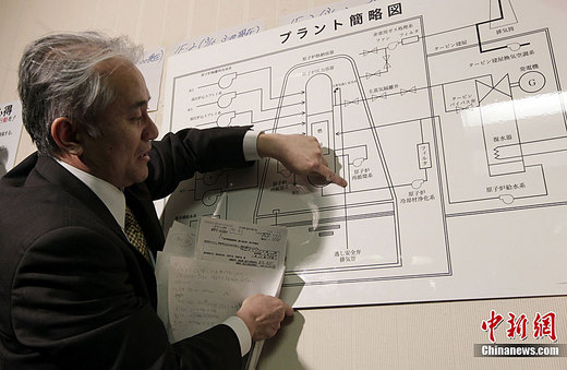 日本政府表示,當(dāng)?shù)貢r(shí)間15日晨6時(shí)10分左右,福島第一核電站2號(hào)反應(yīng)堆附近傳來(lái)爆炸聲。早些時(shí)候的報(bào)道指出,福島第一核電站2號(hào)反應(yīng)堆容器出現(xiàn)部分破損,這表明可能導(dǎo)致更為嚴(yán)重的核泄漏。圖為日本東京核電官員用結(jié)構(gòu)圖講解福島第一核電站2號(hào)機(jī)組爆炸情況。