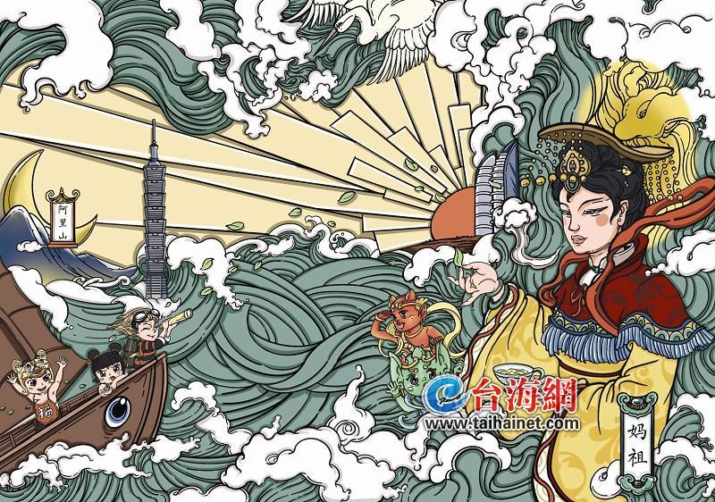 作品繪制了閩南漁女、風(fēng)獅爺、媒人丑角,分別代表了閩臺(tái)民俗文化、信仰文化、戲劇文化。以祥云裊裊和特色建筑作為背景,從各方面展現(xiàn)了豐富多彩、同根同源的閩臺(tái)風(fēng)情。