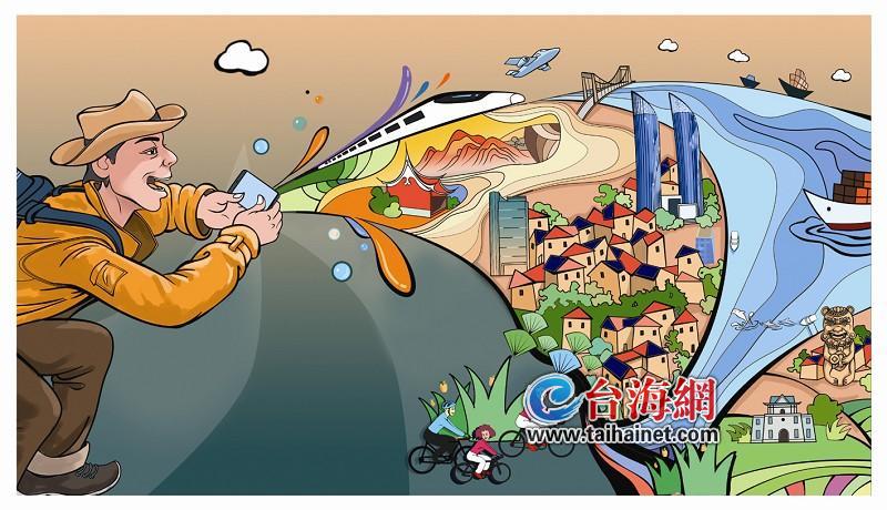 以“閩臺(tái)一日生活圈”為創(chuàng)作靈感,畫面左側(cè)是往返于兩岸的游客,在這全民“拍、拍、拍”的打卡時(shí)代背景下,以游客視角領(lǐng)略海峽兩岸的滄桑巨變。畫面右邊,則有高鐵、單車、廈門雙子塔、金門莒光樓、海運(yùn)、海豚等代表性元素。