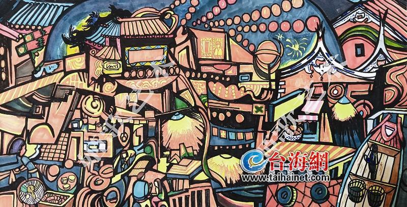 采用立體派的繪畫風(fēng)格,組合了兩岸夜市的景象。熱鬧的攤位、高懸的燈籠、矗立的牌樓、參差的建筑、夜歸的船只……同樣的習(xí)俗,同樣的生活方式,同樣的人間煙火,同樣的打動(dòng)人心。