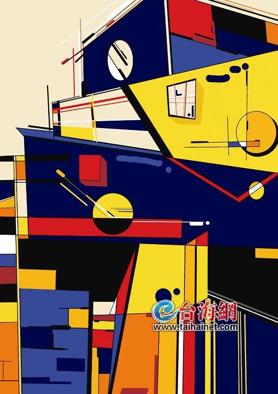 集裝箱是兩岸港口常見的意象,也是當(dāng)今快節(jié)奏生活的縮影。在這幅作品中,它們不再是堅(jiān)硬而冰冷的、抽象化的色塊,色彩熱烈而富有生機(jī),冷與暖交織,表達(dá)兩岸青年新思想與生活激情的碰撞。