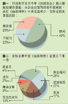 調(diào)查發(fā)現(xiàn),近半受訪者認同新年度施政報告應以經(jīng)濟發(fā)展為重點,而在具體政策范疇方面,“民生福利”居首,其中最多受訪者希望報告能“改善失業(yè)問題”,占36%;其次為“加強打擊青少年吸毒”,占22%;再次是“增加對低收入家庭的支持”,占12%。