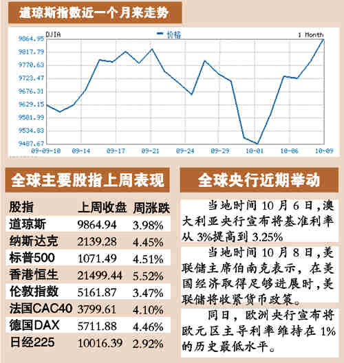 上周全球股市大幅上漲,主要股指平均漲幅超過4%。紐約三大股指上周五收盤小幅上漲,道指收于9864.94點,創(chuàng)一年來新高,離萬元大關(guān)僅一步之遙。香港恒指上周漲1123.95點,漲幅達5.52%。