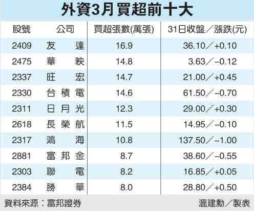 外資3月前十名的買超標(biāo)的集中面板、半導(dǎo)體,其中以友達(dá)買超16.9萬張居冠。摩根士丹利科技產(chǎn)業(yè)分析師王安亞,高喊友達(dá)董監(jiān)改選行情啟動(dòng)。友達(dá)融券余額已從1月下旬高峰的2.3萬多張,降到昨天的6800多張。王安亞認(rèn)為,友達(dá)在2001年、2004年、2007年分別改選董監(jiān),當(dāng)年股價(jià)都有20%至50%的漲幅,今年友達(dá)的改選行情同樣值得期待;此番論點(diǎn)吸引外資買盤先行卡位。