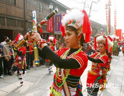 1月31日上午, 由中國文學藝術界聯合會、中國民間文藝家協會、福建省文學藝術界聯合會主辦的“中華情——海峽兩岸民間藝術嘉年華活動”在福州三坊七巷開幕,兩岸民間表演隊伍聯合進行踩街表演是其中的一項活動。 中新社發 祝敏松 攝