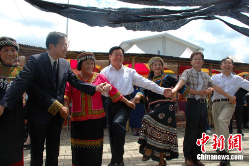 5月22日,四川省長蔣巨峰一行探訪臺灣高雄杉林鄉大愛園區,向當地討教災后重建經驗,并與受“8·8”風災影響遷移到園區的民眾手拉手跳舞。中新社發 劉賢 攝