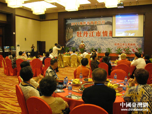 中國臺灣網8月16日牡丹江消息 8月11日, “2011海外臺商龍江行”牡丹江市情推介會在儷淶戴斯大酒店隆重舉行,來自美國、德國、日本、越南等10多個國家的70余名海外臺商、海外臺商團體負責人參加了推介會。會議由牡丹江市委統戰部副部長、市臺辦主任譚春明主持,牡丹江市人民政府秘書長趙士元做市情推介,向“2011海外臺商龍江行”參訪團的海外臺商介紹了牡丹江市的基本市情,以及具有發展潛力的重點項目,會上還為來訪的海外臺商專門播放了體現牡丹江地域特色和旅游資源的宣傳短片。