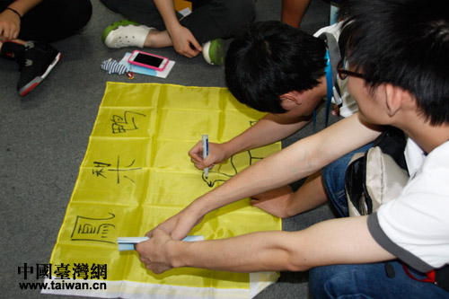 “2013年海峽兩岸紅十字青少年夏令營”營員們按大陸、臺灣學生各一半分成四個小組,分別取名為“鳳梨鴨”、“V2隊”、“心海連”和“心綠隊”。“鳳梨鴨”隊員們繪制隊旗。(中國臺灣網 郜利敏 攝)