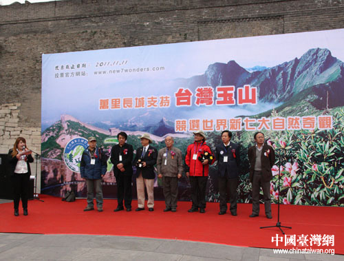 中國臺灣網11月5日北京消息 今天上午,萬里長城支持臺灣玉山競選世界新七大自然奇觀活動在居庸關長城拉開了帷幕,參加活動的有來自臺灣南投縣長李朝卿、臺灣玉山公園管理處前任處長陳隆升、世界新七大自然景觀海峽兩岸代表宋吉明。還有著名長城專家成大林、《萬里長城》雜志主編鄭嚴、長城學會國際交流部主任韓國偉、長城景區相關領導,來自北京大專院校的志愿者和當天上萬名游人也參加了本次活動。