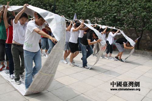18日上午,臺灣青年交流團一行來到了位于山西太原的中北大學,和這所高校的青年學生開展交流活動。沒有座談會式的相互介紹,沒有導游式的校園介紹,一項考驗團隊協作、溝通、互動的拓展訓練使兩岸青年在比賽中相識,在協作中相知,在勝利時相擁。兩岸青年相互結合,分成三只小隊。每個小隊都要并肩戰斗、彼此扶持、爭取勝利。就像他們分別給自己隊伍起得口號一樣:“勇者無敵,叫我第一名”;“威武金剛,無所不行”;“風火風火,超越自我”!