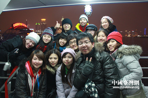 臺灣學生和大陸高校志愿者在黃浦江游輪上合影。(中國臺灣網 栗琰 攝)