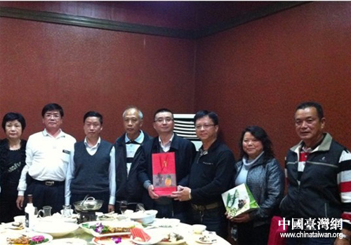 安順市臺辦領導與臺灣彰化縣田尾鄉民代表會林守政主席(左四)、副主席黃坤煌(右三)合影并交換禮物。(圖片來源:安順市臺辦)