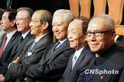 11月13日,為期兩天的“兩岸一甲子”學術研討會在臺北開幕。由于一百一十多位兩岸與會學者中,有多位接近兩岸決策核心的重量級智囊學者,而探討的是兩岸在政治、經濟、文化、軍事、涉外事務等領域的諸多敏感議題,研討會廣受媒體關注。圖為中國戰略與管理研究會會長、中共中央黨校原常務副校長鄭必堅(右三),中國孫子兵法研究會名譽會長李際均(右一)等與會專家學者合影。 中新社發 黃少華 攝