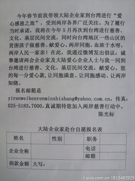 最后,陳光標(biāo)提供了供企業(yè)家報(bào)名的郵箱和傳真,并另附一張報(bào)名表格式。他表示真誠(chéng)期待企業(yè)家加入兩岸慈善行動(dòng)中。(中國(guó)臺(tái)灣網(wǎng) 馮存健)