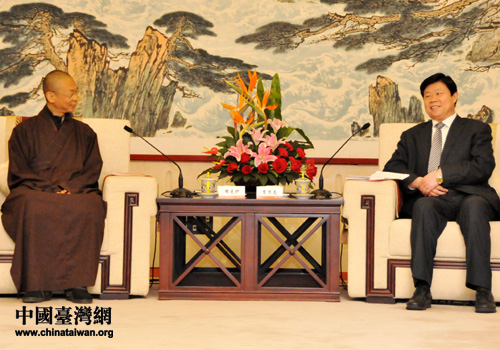 山東省副省長賈萬志在濟南會見臺灣中臺禪寺男眾部副住持、專任研經院院長釋見護。(圖片來源:山東省臺辦)