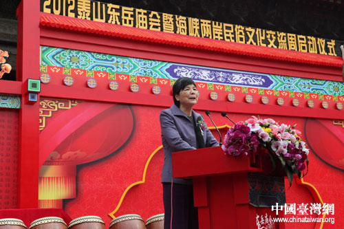 中國臺灣網(wǎng)4月2日泰安消息 4月2日上午9時,由山東省泰安市人民政府主辦,泰山風景名勝區(qū)管理委員會、泰安市人民政府臺灣事務辦公室承辦的“2012泰山東岳廟會暨海峽兩岸民俗文化交流周”啟會儀式在山東泰安舉行。中國國民黨中央評議委員會主席團主席葉金鳳出席大會并致辭。