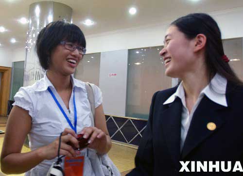 7月24日,臺灣清華大學的辯手許甄芳(左)和復旦大學的辯手張合歡(右)在第一場預賽后交流。當日,第六屆海峽兩岸大學生辯論賽在福州開賽。來自海峽兩岸的16支代表隊將于7月24日至26日展開辯論。 新華社記者 黃臻 攝