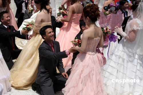 6月28日,50對新人頂著烈日,參加在臺北縣板橋市435藝文中心舉行的露天集體婚禮,現(xiàn)場安排乘坐越野車入場、求婚、擁吻等環(huán)節(jié),場面溫馨而又火爆。圖為眾新郎右膝著地,向新娘獻(xiàn)花、求婚。中新社發(fā) 董會峰 攝