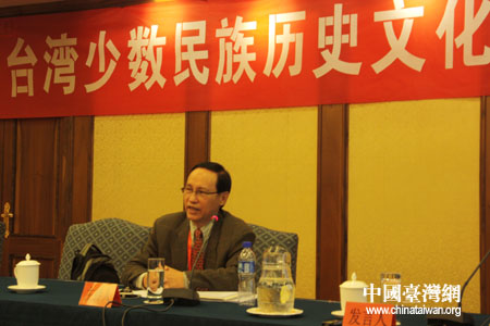 12月23日上午,臺灣少數民族歷史文化學術研討會在北京舉行,臺灣少數民族教授協會理事長蔡中涵主持發言。(中國臺灣網 徐麗華 攝)