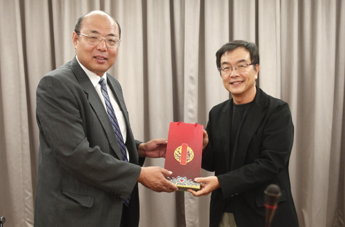 臺灣聯(lián)合晚報社長項國寧(右)與參訪團(tuán)團(tuán)長、中國臺灣網(wǎng)副總編輯吳彤互贈禮物。(中國臺灣網(wǎng) 陳佳慧 攝)