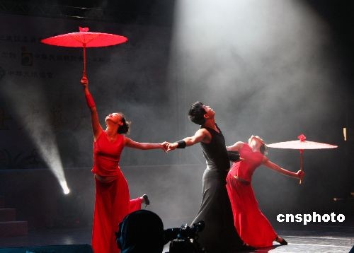 11月30日晚,臺灣第十二屆“弦月之美”身障人士才藝大展在臺北舉行。圖為上海殘疾人藝術團的聾人舞蹈演員在晚會上表演舞蹈《紅黑傘》。 中新社發 周兆軍 攝