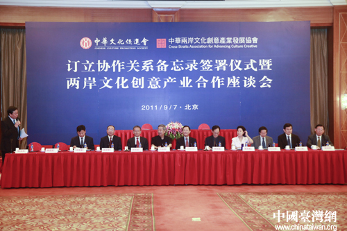 中國(guó)臺(tái)灣網(wǎng)9月7日北京消息 今日,中華文化促進(jìn)會(huì)(以下簡(jiǎn)稱“文促會(huì)”)與來(lái)自臺(tái)灣的中華兩岸文化創(chuàng)意發(fā)展協(xié)會(huì)(以下簡(jiǎn)稱“文創(chuàng)會(huì)”)在京舉行了訂立協(xié)作關(guān)系備忘錄簽署儀式,并就兩岸文化創(chuàng)意產(chǎn)業(yè)合作展開座談。