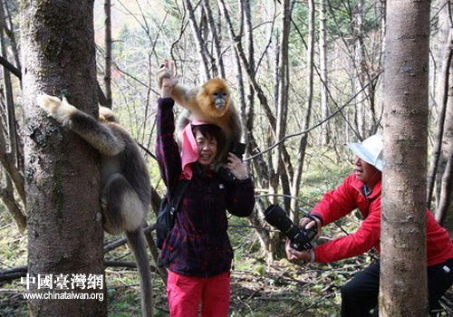 采風團成員與金絲猴互動。(神農架林區 吳太地 攝)