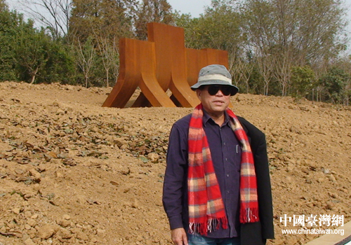 屠國威先生在雕塑作品《人從眾》前留影(蕪湖市臺辦 靳能江 攝)