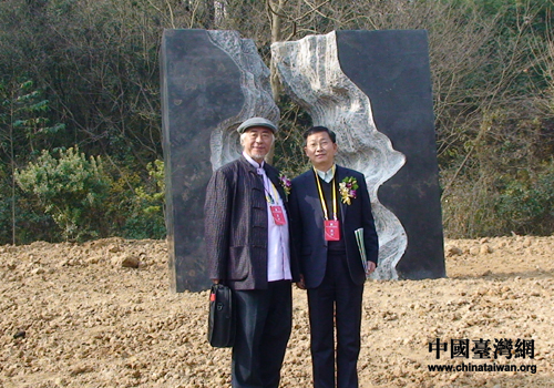 楊奉琛先生(左)在雕塑作品《闐渠心開》前留影(蕪湖市臺辦 靳能江 攝)