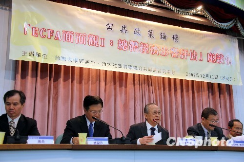 近來臺灣內部密集討論兩岸經濟合作框架協議(ECFA)議題,從產業界、經濟主管部門到學界都各自發表獨立見解,闡述若簽署ECFA的利弊得失。圖為于臺灣大學召開的“ECFA面面觀:總體經濟影響評估”座談會,臺灣大學經濟系教授胡勝正(左三)、“經濟部次長”林圣忠(左二)、“陸委會副主委”高長(左一)、臺灣大學教授林向愷(左四)等就相關議題作報告。 中新社發 曾嘉 攝