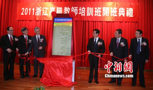 由浙江省高等教育學(xué)會(huì)和臺(tái)灣科技大學(xué)共同舉辦的 “浙江在臺(tái)高校師資培訓(xùn)基地掛牌及2011浙江高職教師培訓(xùn)班開班儀式”今天下午在臺(tái)北舉行。