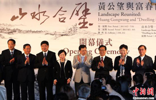 “山水合璧—黃公望與富春山居圖特展”6月1日上午在臺北故宮舉行開幕儀式。浙江省委書記趙洪祝、國家文物局局長單霽翔、臺灣中華文化總會會長劉兆玄、臺北故宮博物院院長周功鑫等出席。中新社發 趙振清 攝