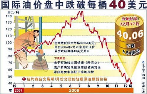 7月23日,油價首次跌破125美元。9月份,美國第四大投資銀行雷曼兄弟公司宣布破產,美國第三大投資銀行美林公司被美國銀行收購。一系列消息極大地打擊了投資者對全球經濟的信心,從而引發(fā)油價“跳水”。國際油價一路跌破100美元、50美元、40美元, 12月22日,紐約市場油價跌至每桶33.87美元。自從今年7月中旬以來,國際油價已經累計下跌了約73%。