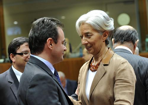 5月9日,在比利時(shí)首都布魯塞爾,法國(guó)經(jīng)濟(jì)、財(cái)政與就業(yè)部長(zhǎng)拉加德(右)與希臘財(cái)政部長(zhǎng)帕帕康斯坦季努在歐盟財(cái)政部長(zhǎng)特別會(huì)議舉行前交談。當(dāng)天,歐盟舉行財(cái)長(zhǎng)特別會(huì)議,討論捍衛(wèi)歐元穩(wěn)定、增強(qiáng)市場(chǎng)信心的具體實(shí)施方案。不斷升級(jí)的希臘債務(wù)危機(jī)和歐盟其他國(guó)家高額的公共債務(wù),使得市場(chǎng)對(duì)歐元區(qū)和歐元的前景普遍擔(dān)憂。今年以來,歐元兌美元匯率已經(jīng)下跌超過10%。歐盟機(jī)構(gòu)和歐元區(qū)國(guó)家領(lǐng)導(dǎo)人在7日特別峰會(huì)后表示將“不惜一切代價(jià)”捍衛(wèi)歐元和歐元區(qū)的穩(wěn)定。新華社記者武巍攝