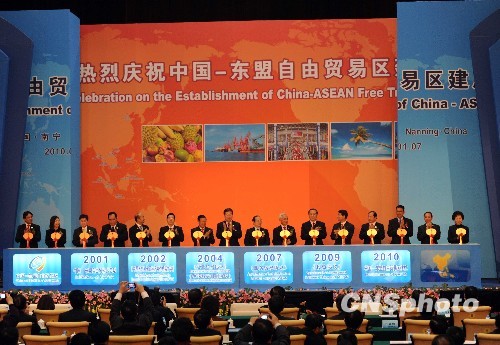 1月7日,中國—東盟自由貿易區建成慶祝儀式在南寧舉行。全國政協副主席黃孟復宣布儀式開始,與會嘉賓用金鑰匙共同開啟自貿區合作大門。中國商務部副部長易小準、東盟副秘書長孫達姆、老撾副總理宋沙瓦·凌沙瓦、二OO七年諾貝爾經濟學獎獲得者埃里克·馬斯金等數百位嘉賓出席慶祝儀式。 中新社發 蔣雪林 攝