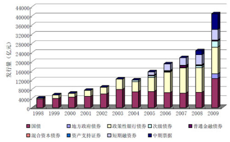 2009年,財(cái)政部通過(guò)銀行間債券市場(chǎng)發(fā)行債券1.5萬(wàn)億元(包括地方政府債券2000億元),國(guó)家開發(fā)銀行、中國(guó)進(jìn)出口銀行、中國(guó)農(nóng)業(yè)發(fā)展銀行在銀行間債券市場(chǎng)發(fā)行債券1.2萬(wàn)億元。2009年,23家商業(yè)銀行發(fā)行次級(jí)債券總計(jì)2669億元,發(fā)行量為前一年的3.7倍,2家商業(yè)銀行發(fā)行混合資本債券65億元。普通金融債券發(fā)行量穩(wěn)步增長(zhǎng),金融機(jī)構(gòu)融資渠道進(jìn)一步拓寬,包括商業(yè)銀行、企業(yè)集團(tuán)財(cái)務(wù)公司等在內(nèi)的10家金融機(jī)構(gòu),發(fā)行普通金融債券337億元,發(fā)行量較前一年增長(zhǎng)34.8%。亞洲開發(fā)銀行再次發(fā)行人民幣債券10億元,至此我國(guó)境內(nèi)國(guó)際開發(fā)機(jī)構(gòu)人民幣債券已達(dá)40億元。非金融企業(yè)債務(wù)融資工具市場(chǎng)迅速發(fā)展,2009年銀行間債券市場(chǎng)共發(fā)行短期融資券263只,累計(jì)發(fā)行面額4612.1億元,中期票據(jù)172只,累計(jì)發(fā)行面額6885億元,同時(shí)為支持中小企業(yè)發(fā)展,創(chuàng)新推出中小非金融企業(yè)集合票據(jù),已成功發(fā)行12.65億元。2009年,企業(yè)通過(guò)企業(yè)債券與公司債券融資約5000億元。