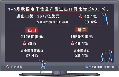 圖表:1-5月我國電子信息產品進出口同比增長43.1%。 新華社發