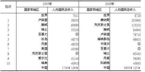 2005年和2009年中國與世界前十位國家和地區人均國民總收入比較 單位:美元 注:①無數據,近似排位。 來源:國家統計局網站