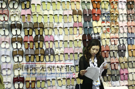 一家制鞋企業的工作人員在3月的中國華東進出口商品交易會展位內清點商品。本報記者 裴鑫/攝