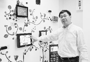 臺灣新大陸資訊科技公司總經理閻蔚中介紹新產品。
